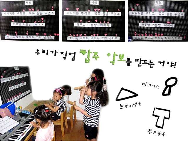 트라이앵글, 우드블럭, 마라카스, 피아노 4가지 악기를 이용해 합주를 시도하는 어린이들은 함께 악기를 연주하기 위해서는 악기 악보가 필요함을 알게 됩니다. 그래서 교사는 음률영역에 ‘새싹’ 노래의 가사가 적혀있는 커다란 가사판을 제공해 줍니다. “여기 가사 위에 악기를 그려넣자. 그러면 어디 치는지 알 수 있을 거야.” “우드블럭은 ‘ㅜ’이렇게 표시하고, 트라이앵글은 ‘△’로 표시하자.” “우드블럭은 어디에 치는게 좋을까?” “꼭꼭 물을 주었죠. 에서 ‘꼭꼭’에 치면 좋겠다.” “앞에 쳐서 박자를 맞춰도 좋아.”“트라이앵글은 마지막에 쳐서 소리가 울리게 하자.”