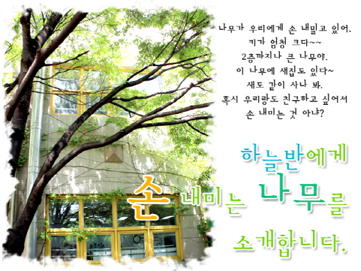 하늘반 창밖은 자연이 그린 여러 가지 풍경화를 보여줍니다. 벚꽃이 흩날리는 것을 보며 새하얀 눈을 생각하기도 하고, 커다란 나무의 가지들을 보면 마치 하늘반을 안아주는 포근한 품을 생각하기도 합니다. 교실에서 보이는 여러 나무들 중에서도 하늘반 어린이들의 가장 큰 관심을 받은 나무는 바로 하늘반과 가장 가까이 자리 잡고 있는 느티나무입니다.