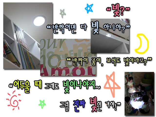 - 우리 눈으로 보았을 때 반짝거리는 것은 모두 “빛”이라고 결정짓는 아이들에게 진정한 “빛”의 의미에 대해서 알아보고자 이야기를 나누었습니다.