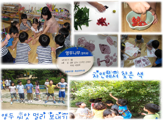 “선생님, 여기에 빨간 열매에요.” “무슨 냄새도 나는 것 같아요.” 아이들은 신기한 열매에서 나는 향기와 모양에 관심을 가집니다. “색깔은 빨간데.. 먹어도 되나?” 열매의 정체를 알기위해 아이들은 열매를 직접 따보기로 하였답니다. “좀 보들보들해.” “복숭아 냄새도 나” “어? 나 언제 이거 먹어 본적 있는데~” “나무에 이름이 적혀있어요.” 유치원 마당에 있는 앵두와 버찌를 만나고 아이들은 너무 즐거워했답니다. “이거 만지니까 색깔도 나와요.” 우리는 이 열매로 물감을 만들어 보기로 하였답니다. 어떤 색깔이 나올까요? 녹색으로 변한 유치원 풍경도 감상하고 아이들과 앵두를 맛보며 자연과 함께하는 시간을 가져보았습니다.