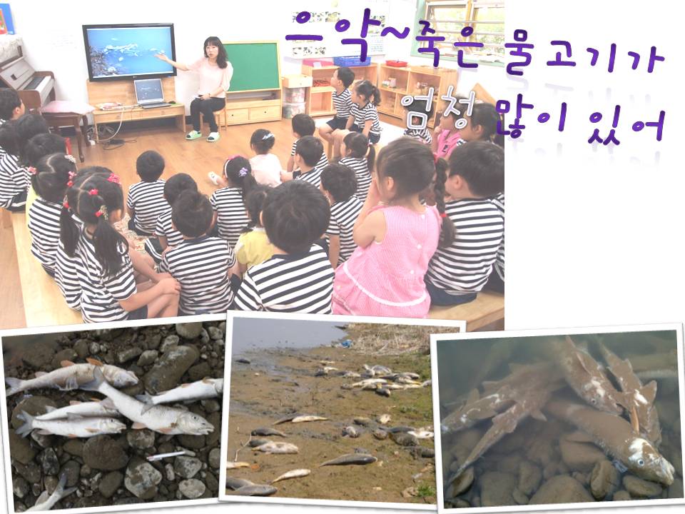 물고기의 떼죽음 사진을 함께 보며 물고기가 왜 죽었는지 이야기 나누어 보았습니다.