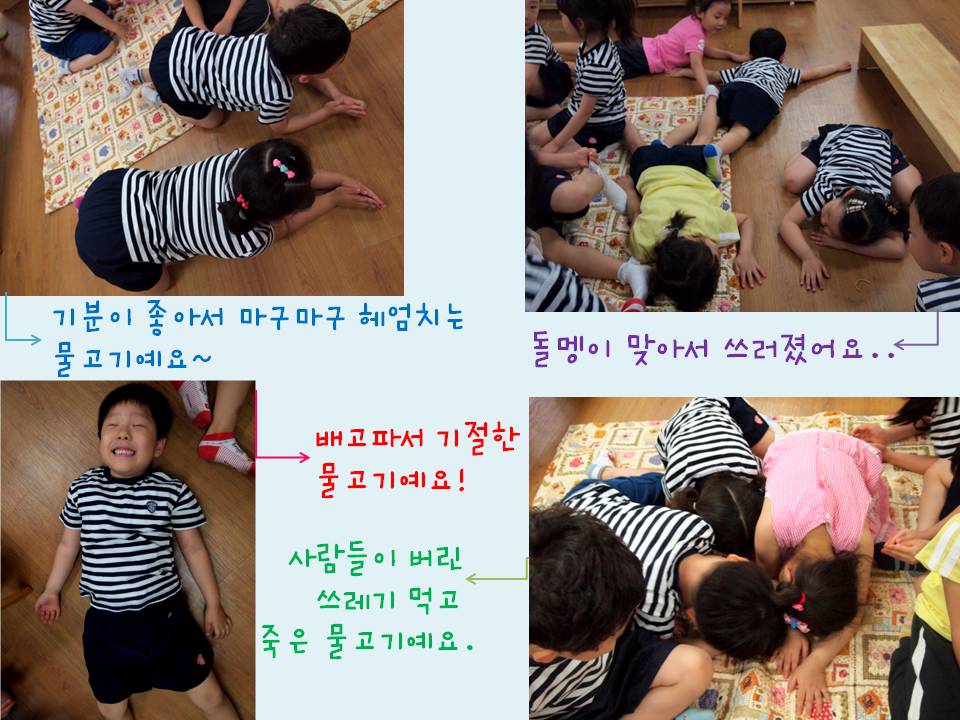 “어떤 아저씨가 쓰레기통인 줄 알고 음식을 버려서 그래요.”,“낚시 줄에 걸려서 물고기가 다 죽었어요.” ,“아저씨들이 담배피고 물에 던져서요~”, “물이 더러워서 죽었어요.”, “돌 던져서 물고기가 맞아서 죽은 거예요.”, “먼지가 있어서요~”, “맞아. 그래서 물고기가 스트레스 받아서 죽었어요.”