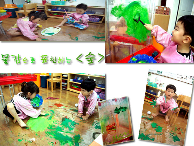 미술영역에서는 숲을 다녀왔던 경험을 떠올려 물감으로 ‘숲’을 표현 해 보는 활동이 이루어집니다. “이것 좀 보세요. 초록색 나무예요.” “우리 손바닥 나뭇잎 찍자!” “이건 산딸기예요.” “이 숲 속에는 괴물들이 많이 살아요.” “사자도 있고 내가 좋아하는 토끼도 있어요.” 아이들은 물감을 사용하여 숲에서 보았던 것에 상상을 더해 표현 합니다.