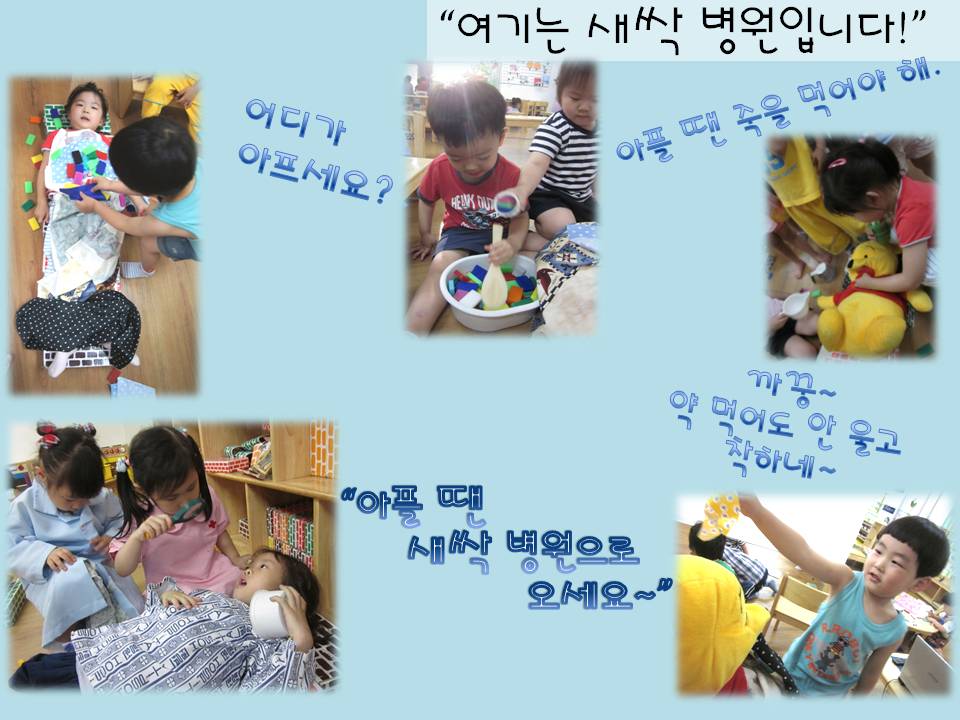 새싹반 친구들이 여러명 모여서 병원을 하나 만들었답니다. 과연 새싹 병원에서 무슨 일들이 일어나고 있을까요? 역할영역 이야기를 들여다봅니다.