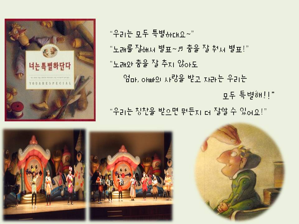 “우리 모두는 특별해.” “엄마, 선생님이 사랑해 주니까 우리는 특별한 거야.” “잘 하는 게 없어도 친구들이 있으니까 특별 한 거야.”