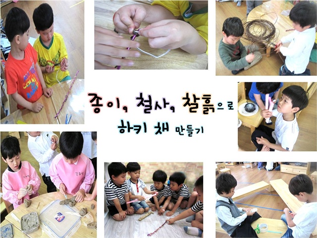 요구르트 병으로 막대를 만들어 하키 경기에 참여하던 어린이들은 요구르트 병으로 만든 것 보다 더 튼튼하게 하키채를 만들 수 있는 방법에 대해 고민합니다. 유아1: 어머니 참여수업 때 종이를 돌돌 말아서 만들기를 했었는데 정말 튼튼했어. 유아2: 하키 채도 쇠로 되어 있으니까 철사를 이용해 하키 채를 만들어 보면 어때? 유아3: 철사로 만들면 휘지 않을까? 유아4: 찰흙은 마르면 단단해 지니까 찰흙으로 만들어도 좋을 것 같아. 유아5: 찰흙은 마르면 갈라질 것 같은데... 유아6: 그럼 우리 종이, 철사, 찰흙 중에 어떤 매체를 이용해 하키채를 만들면 가장 튼튼할지 한번 실험해 봐요! 어린이들은 이전의 경험을 바탕으로 종이, 철사, 찰흙을 활용해 하키 채를 만들어 봅니다.유아1: 종이를 많이 말수록 더 단단해 지는 것 같아. 유아2: 철사는 가늘수록 더 잘 휘니까 굵은 철사로 모양을 잡아야 할 것 같아. 유아3: 찰흙 안에 나무젓가락이나 굵은 철사를 넣으면 더 튼튼한 하키 채를 만들 수 있을 거야!