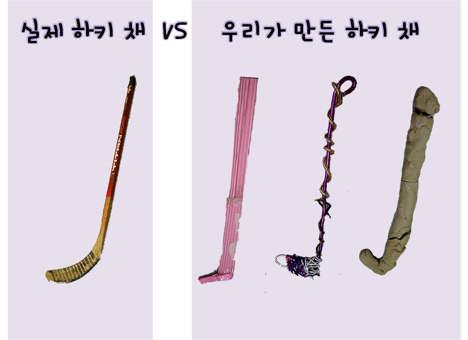 세 가지 매체를 활용하여 하키 채를 만든 후 비교해 봅니다. “찰흙은 마르니까 단단해 지긴 하지만 갈라지고 부서져. 종이나 철사를 이용해 하키 채를 만드는 것이 좋겠어!”, “하키는 서서 하는 경기니까 더 길고 튼튼하게 만들어야 할 것 같아.”,“철사를 한 줄로 하는 것 보다 두 줄로 하면 더 튼튼하게 만들 수 있지 않을까?”