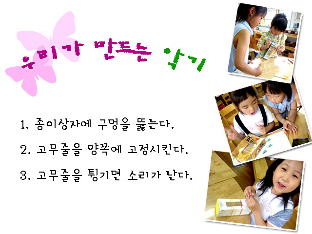“우리가 만든거 꼭 기타같다.” “근데 기타는 도레미파솔라시도~ 다 나오잖아. 우리가 만든 건 그냥 소리만 나오고.” “기타는 왜 소리가 많이 나지?”