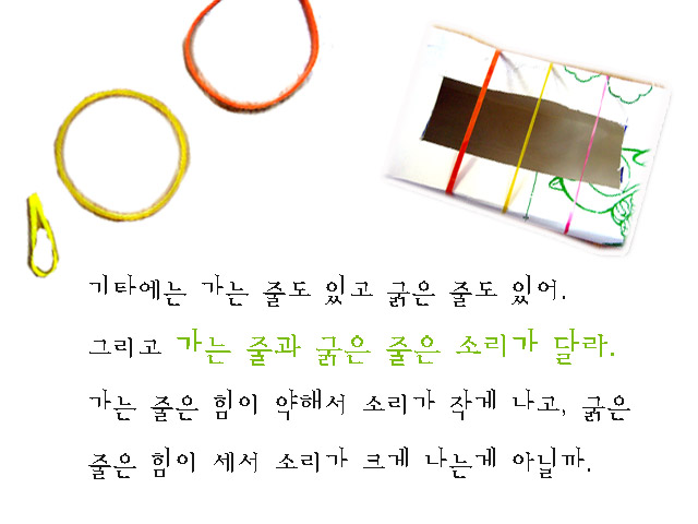 “아! 알겠다. 기타는 줄이 굵은 것도 있고 가는 것도 있어. 그래서 소리가 다르게 나는거야.” “그럼 굵기가 다른 고무줄로 기타를 다시 만들어보자.”