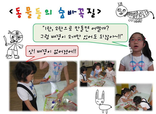 우리반에서 함께 살고 있는 물고기에 관심을 가지고 돌보기를 시작하면서 유아들은 하나의 생명체에 대한 소중함을 깨닫고 따스한 마음으로 품어 봅니다. 또 작은 물고기들에게 멋진 이름도 지어주기로 하였답니다. 물고기는 어떤 멋진 이름을 가지게 될까요?<동화만들기>다른 영역놀이를 하던 동화팀이 다시 모여 동화만들기를 합니다. 오랜만에 뭉쳐서인지 내용도 가물가물합니다. 유아: 선생님~ 우리 배경이 몇 개였죠? 유아: 우리 주인공들은 다 어디로 간거야~!!