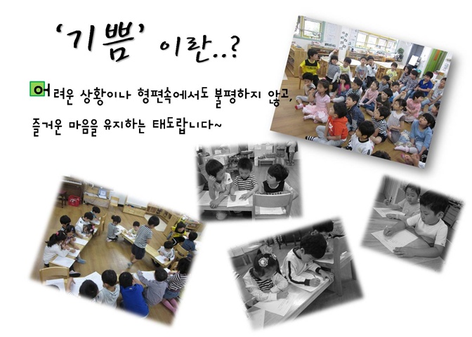 유아들은 진행했던 순서대로 배경, 주인공, 내용 순으로 차근차근 기억을 떠올려봅니다. 배경이 없어져 고민하던 유아중 한 유아가 시리즈로 동화를 들려주면 어떻겠냐고 아이디어를 제안합니다. 유아들은 이어짐에 관심을 가지고, 1탄, 2탄 내용을 나누기 시작합니다. “1탄과 2탄 사이에는 뭐 파는 거 있잖아 그런 광고 같은 것도 넣으면 어때? 심심하지 않게 말이야!” 유아들은 경험을 바탕으로 계속적인 아이디어를 제안합니다. 동화는 앞으로 어떻게 진행되어 질까요? <동물들의 숨바꼭질의 1화>를 어떻게 탄생할 지 기대해 봅니다.<기쁨이란>유아들에게 ‘기쁨’은 무엇일까요? 기쁨은 내가 즐겁고, 행복할 때를 나타내는 말입니다. 유아들은 언제 제일 기쁠까요?