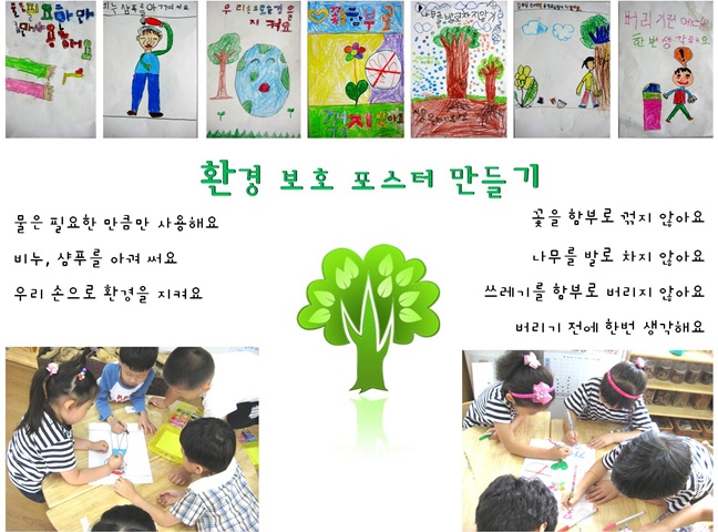 어린이들은 환경을 보호할 수 있는 다양한 방법에 대해 생각해 본 후, 여러 사람들에게도 알리기 위해 포스터를 만들기를 계획합니다. 환경을 위해 우리가 실천할 수 있는 일을 문구로 만들어 보고, 문구에 어울리는 그림으로 무엇을 그릴지 팀별로 토의를 하여 포스터를 만들어 봅니다. 생각을 조율하고 협력하여 하나의 포스터를 만드는 잎새반 친구들의 모습이 너무 멋져 보입니다.