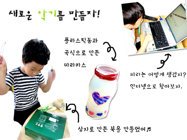 “플라스틱 통에 콩을 넣어서 흔들면 소리가 나.” “좁쌀을 넣으면 또 다른 소리가 들려. 꼭 마라카스 같아.” “나는 상자를 포장해서 북을 만들었어. 나무젓가락으로 채도 만들었는데 퉁퉁치면 북소리가 들려.” “ 피리를 만들었어. 종이를 말고, 구멍을 내면 피리가 완성돼. 그런데 내 피리는 이상하게 소리가 나질 않아.” 어린이들은 인터넷을 이용해 악기를 검색해보고, 직접 만들어보면서 다양한 악기의 종류를 알아가고, 소리에 관심을 가집니다. 이를 통해 소리에 대한 민감성을 기르고, 주변의 다양한 소리에도 귀를 기울이게 되기를 기대해봅니다.