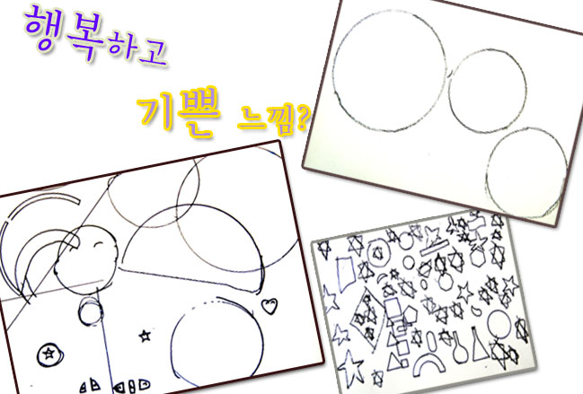 도형, 색, 매체라는 단계와 한계성을 주고 작업하면서 어린이들이 표현할 수 있는 다양한 방법을 지원하고자 합니다. 동그라미, 삼각, 사각 등 주위에서 흔히 볼 수 있는 도형들에게서 느껴지는 다양한 감정에 대하여 이야기 해보고 객관적인 동의를 얻은 도형들의 조합으로 감정을 표현해 보았습니다. 어린이들이 선택한 그림에 사용된 다양한 도형과 배치를 감상해봅니다.