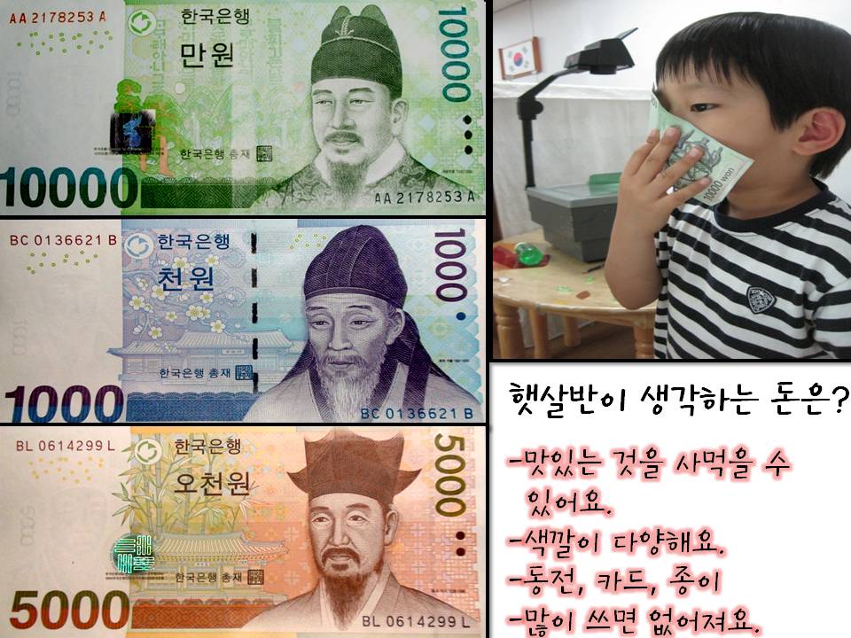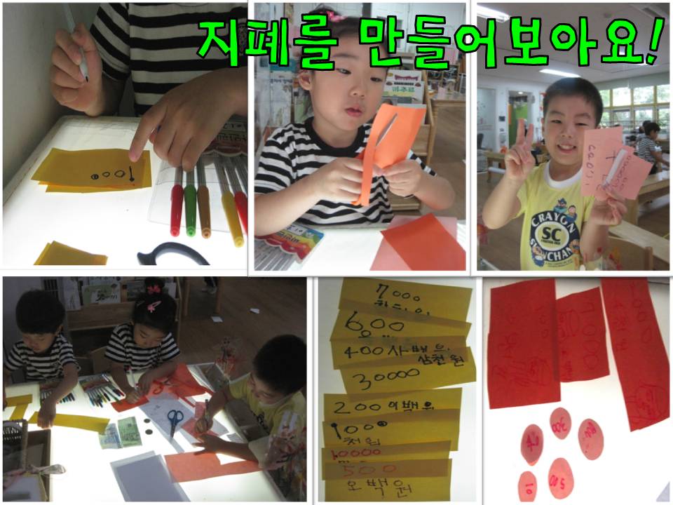 음식점 놀이를 하는 친구들에게 손님이 있고 없고는 그다지 중요하지 않았어요. 그저 요리를 만드는데 관심이 있었어요. 그 때, 식당놀이를 하던 친구가 교사에게 다가옵니다. 유아: 음식점에는 돈을 내고 음식을 사 먹는데 여기는 왜 없나요? 음식점에서 돈을 내고 음식을 사 먹는 이유에 대해 이야기를 합니다. 그리고 맛있는 음식을 사 먹으려면 돈이 필요하다는 것을 알게 됩니다. 친구들이 생각한 돈은 어떤 것인지에 대해 이야기를 나누어보았어요. 교사: 돈은 어떤 것일까요?