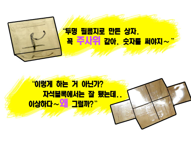 자주 놀이하던 어린이들 가운데서도 정육면체 상자를 만드는 방법들이 다 다르기에 각자의 방법을 친구들에게 소개 해 주기로 합니다. 어린이들의 전략은 크게 2가지로 나누어집니다.
