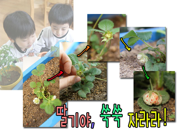 교사는 어린이들에게 투명한 종이(필름지)를 제공하였습니다. 자석블록이 투명한 것처럼 투명한 필름지는 도형의 안을 들여다보게 함으로써 어린이들에게 또 새로운 시각을 가져다주지 않을까 하는 기대를 가지고 말이죠. 그런데 자석블록과는 다르게 면과 면이 붙지 않는 이 투명한 필름지를 만나자 어린이들은 또 다시 문제에 부딪힙니다. “이상하다~ 왜 안 되지?” 이러한 문제는 좀 더 정확하게 도형을 이해하게 하지 않을까요? 어린이들의 놀이를 기대해 봅니다.★딸기야, 쑥쑥 자라라~★