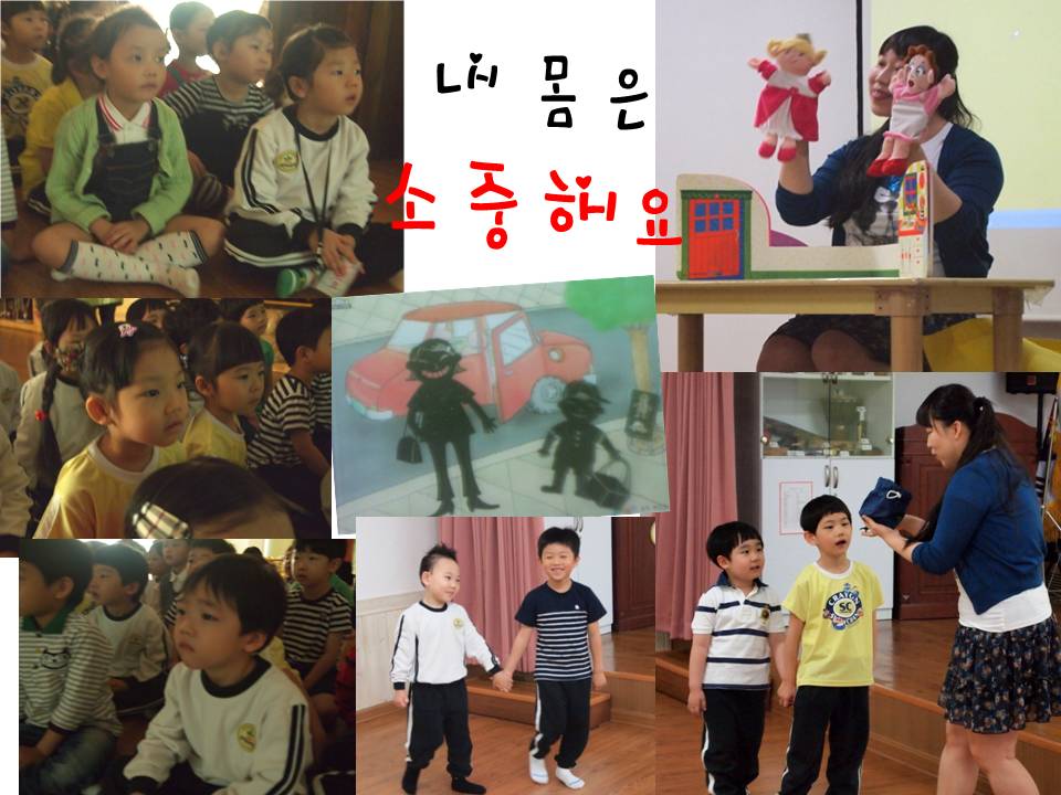 낯선 사람이 내가 좋아하는 장난감을 주면서 “같이 가자~” 라고 하면 어떻게 해야 하는지, 친구 집에 놀러 갔는데 사촌 오빠가 내 몸을 만지면 어떻게 해야 하는지, 우리 몸에서 가장 소중한 부분은 어디인지 플래시동화와 인형극, 그림을 보며 알아보았습니다. 우리 몸은 모두 소중한 곳이며 낯선 사람이 다가왔을 때는 “싫어요~ 안돼요~ 하지마세요” 라고 말한 후 집으로 가서 부모님께 이야기하기로 했답니다.