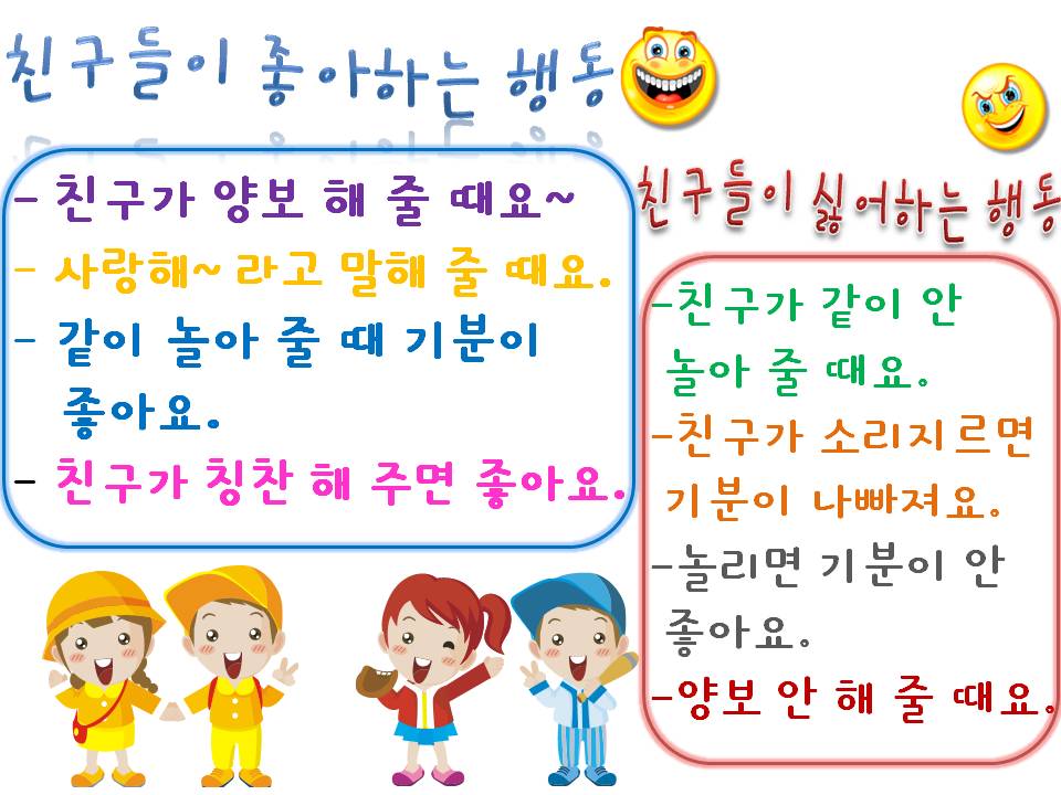 교사: 친구들이 어떤 행동을 하면 기분이 좋은가요?