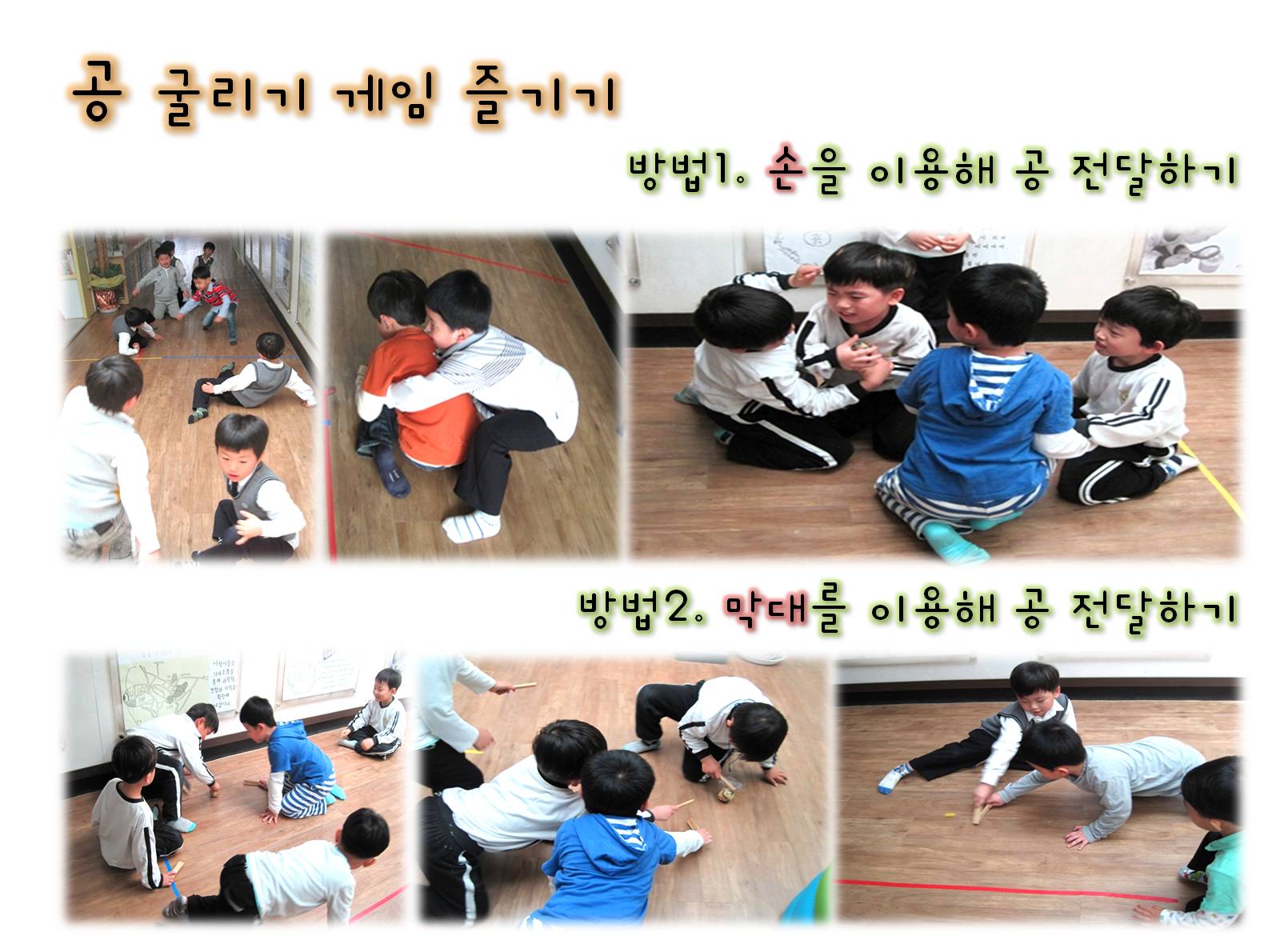 손으로 공을 전달하며 공굴리기 게임을 하는 과정에서 친구와 몸이 많이 부딪히게 되자 어린이들은 다른 방법으로 공굴리기 게임을 즐길 수 있는 방법에 대해 고민하게 됩니다.