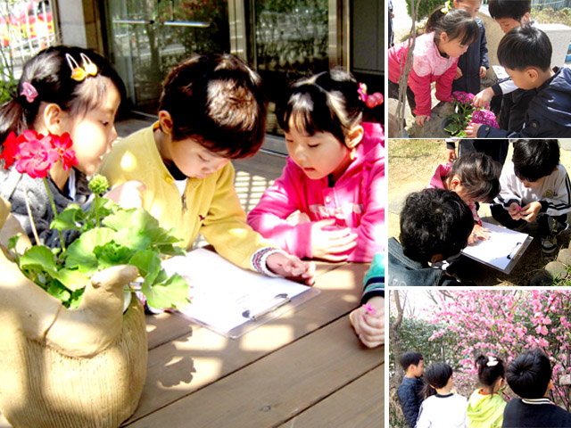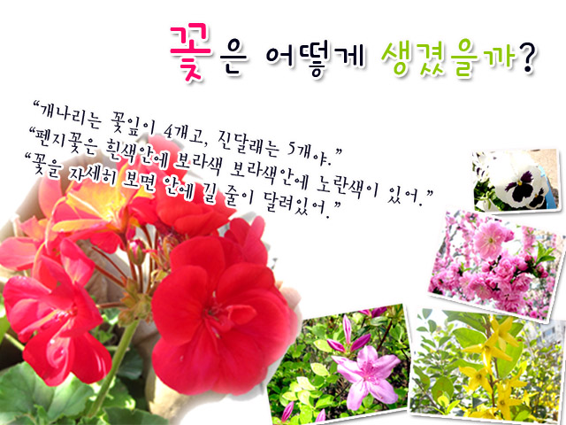 “꽃이 꼭 나비처럼 생겼어.”, “우리가 조사한 꽃은 바깥쪽은 흰색, 안쪽은 보라색, 더 안쪽은 노란색이야.”, “자세히 보니까 꽃잎에 작은 점들이 찍혀있어.”, “꽃 안에 긴 줄 같은게 나 있어.”, “개나리는 꽃잎이 4개 있어. 그런데 진달래 꽃은 5개야.” 저마다의 독특성을 가진 꽃들은 한 데 모여 아름다움을 더하고 있었습니다.