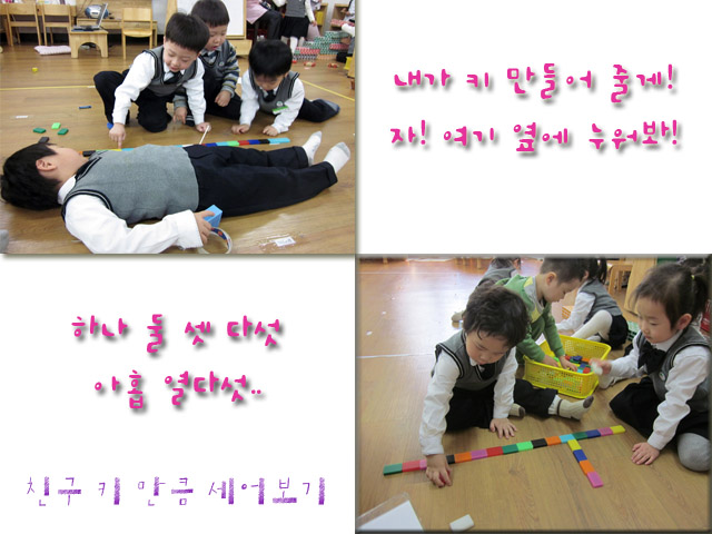 “자 옆에 누워봐!” 한 친구가 블록 옆에 눕고 다른 친구들은 친구의 키만큼 블록을 세어봅니다.