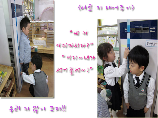 유아들은 놀이 속에서 서로의 모습에 관심을 가지면서 <친구와 관계 맺기> 더불어 <수 세기> 활동도 하게 됩니다. 새싹들이 만들어 나가는 <키 재기>놀이는 어떤 방향으로 진행될까요?<긍정적인 마음 가지기>