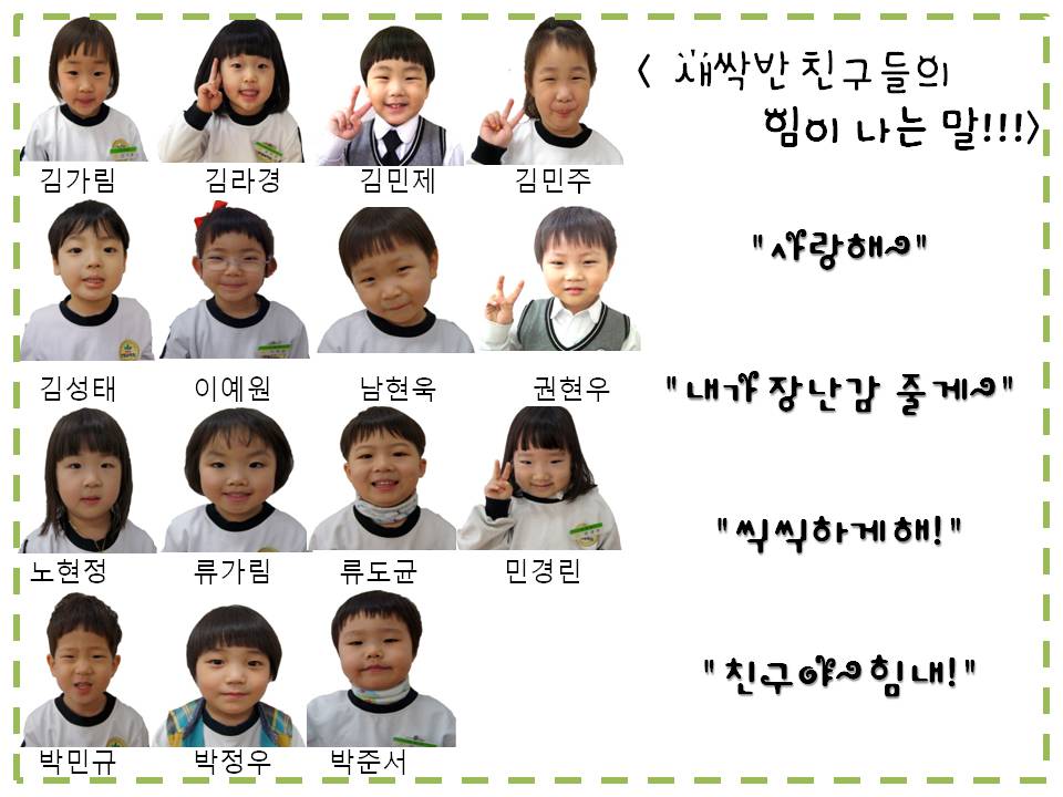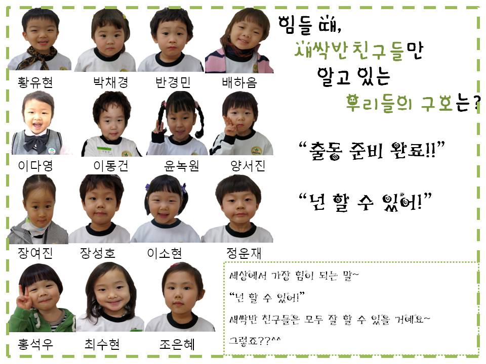 새싹반 친구들이 앞으로 맞이할 여러 상황을 긍정적 태도를 가지고 대할 수 있도록 “넌 할 수 있어!”라고 말 해 주세요~!