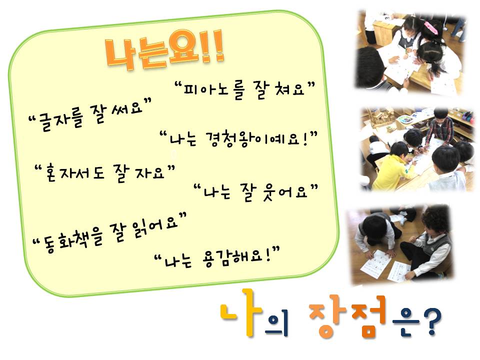 긍정적인 태도에 대해 여러가지 활동을 경험해 보며 나를 조금 더 긍정적으로 생각해 보는 계기가 되었습니다. 나에 좋은 생각들을 조금 더 표현해 보고자 내 안의 훌륭한 장점에 대해 생각해 보는 시간을 가져보았습니다. “난 경청을 잘해” “난 친구를 잘 도와줘” “난 만들기를 잘해” “난 설거지를 잘 도와줘” 장점이란 좋거나 잘하거나 긍정적인 점을 말합니다. 나의 장점에 대해 자신 있게 이야기 하면서 자신을 긍정적으로 바라보고 스스로를 이해하고 안다는 것이 얼마나 중요한지를 느낄 수 있었답니다.<인형극 만들기> 줄거리가 완성되어 이제 유아들은 인형극의 배경을 만들기 시작합니다.