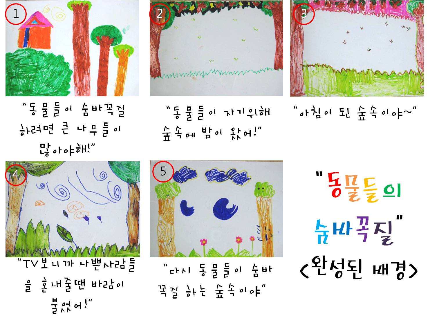 유아: 첫 번째 장면은 숲속에서 숨바꼭질 하는 장면이 필요해! 유아: 두 번째 장면은 나쁜 사람들이 밤에 동물들을 잡아가는거! 유아: 세 번째 장면은 아침이 되어서 발견하는 장면이야! 유아: 그럼 두 번째랑 세 번째는 배경이 똑같아야 되겠다! 유아: 그래! 그런데 밤이랑 아침이랑 표현해야 돼! 유아: 네 번째 장면은 숲속에서 나쁜 사람들을 무찌르는 거~ 유아: 마지막은 다시 숲속에서 숨바꼭질 하는거야! 유아들은 줄거리를 보며 다섯장면으로 나눕니다. 나눈 장면들 속에서 어떻게 표현하면 좋을지 이야기를 나누고, 투명용지에 그려봅니다. 서로의 배경을 보며 생각을 보태어 주며 배경을 완성합니다. 배경을 만들며 의견을 제시하고, 제시된 좋은 의견을 받아들이며 유아들은 조절을 배워갑니다.