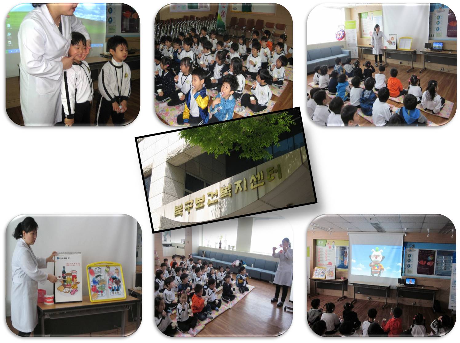 <보건소를 다녀와서> 화창한 봄 날, 두근거림을 안고 ‘구강교육’을 받기위해 보건소에 다녀왔습니다. 유아들에게 보건소란, ‘아빠 담배 못 피게 하는 곳’, ‘주사 맞는 곳’ 등이라 생각하던 유아들은 혹시 입안을 치료하지는 않을까.. 하는 불안감과 설레임을 안고 보건소로 향했습니다. 보건소에 도착한 우리를 선생님이 반갑게 맞이해 주시고, 또 양치 선생님은 우리에게 이를 보호해야하는 이유와 이에 좋은 음식과 나쁜음식, 충치가 생기지 않게 하는 방법도 알려주셨습니다. 시약도 이에 묻혀 양치 후 청결 상태를 확인하고, 깨끗하게 양치하는 방법을 배워 직접 해보는 시간도 가졌습니다. 치아보호에 대한 동영상을 보며 내 이의 소중함도 느낄 수 있었습니다. 그리고 보건소에서는 치료도 하고, 예방교육도 함께 한다는 것도 알게 된 소중한 하루였습니다.
