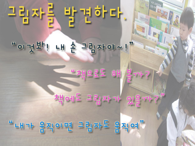 “와~내 손 그림자다.” “이건 밖에 있는 나무 그림자 같은데?” “책으로 그림자 만들어 볼까?”