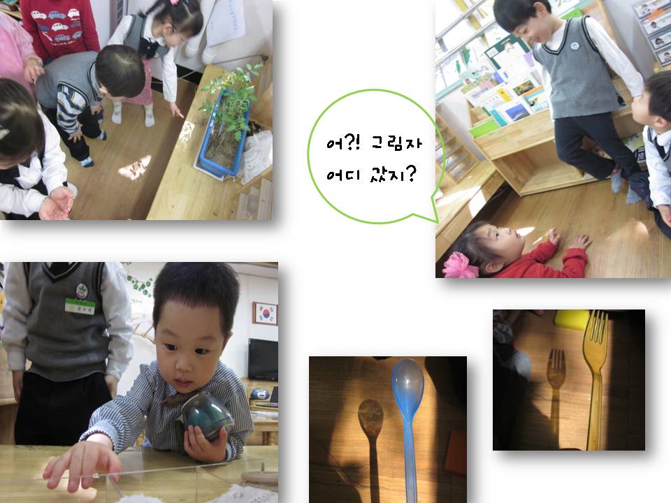 놀이시간이 시작되고 유아들은 햇볕이 들어오는 창가에서 그림자를 찾기 시작합니다.