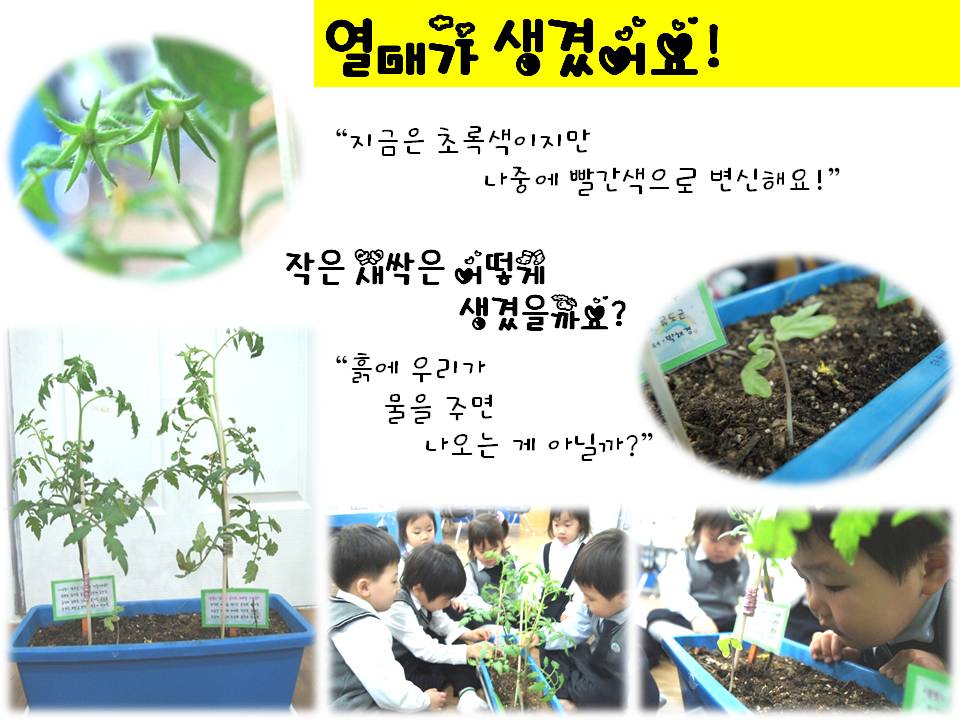토마토 열매가 열리고, 토마토 옆의 작은 새싹의 발견은 토마토 돌봄이의 역할로써 식물에 더욱 관심을 가지고 토마토의 상태와 변화를 알아 볼 수 있었던 좋은 계기가 되었습니다.<우리들의 역할놀이>