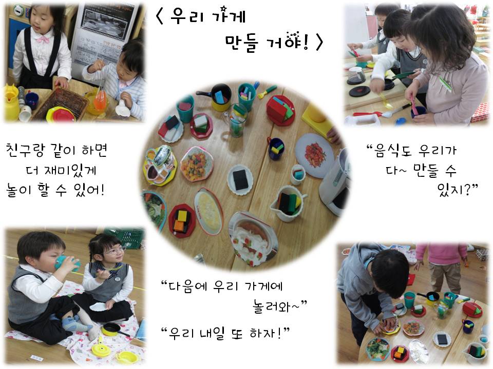 "우리 엄마놀이 할래?" "같이하자! 나도 할래!" "난 왕자래~" "여기는 가게야~" "음식은 많이 있어." "접시 주는 사람도 필요하지!" "설겆이는 내가 할게." "나는 음식 주는 사람!" "컵에 물 따라 줄까요? 슝~ 여기요~" "이 음식 한번 먹어보세요. 맛이 좋아요!" "냠냠~" "다음에 또 올게요~"