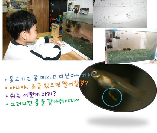 관찰을 통해 아이들은 물고기도 똥을 눈다는 것을 알게 되었고 ‘물고기도 사람처럼 숨을 쉴까?’ 라는 궁금증을 가지게 됩니다.