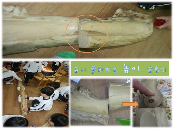 교사: 왜 공이 잘 안 굴러 가는 것 같니? “높이가 달라서 그래요.” “높이가 맞아야 되요.그런데 어떻게 하지?” 공이 더 잘 굴러 가는 평평한 길을 만들기 위해 블록의 높이가 같아야 함을 발견합니다. 그리고는 잠시 뒤 블록의 높이를 맞추기 위한 다른 방법을 생각해 냅니다.