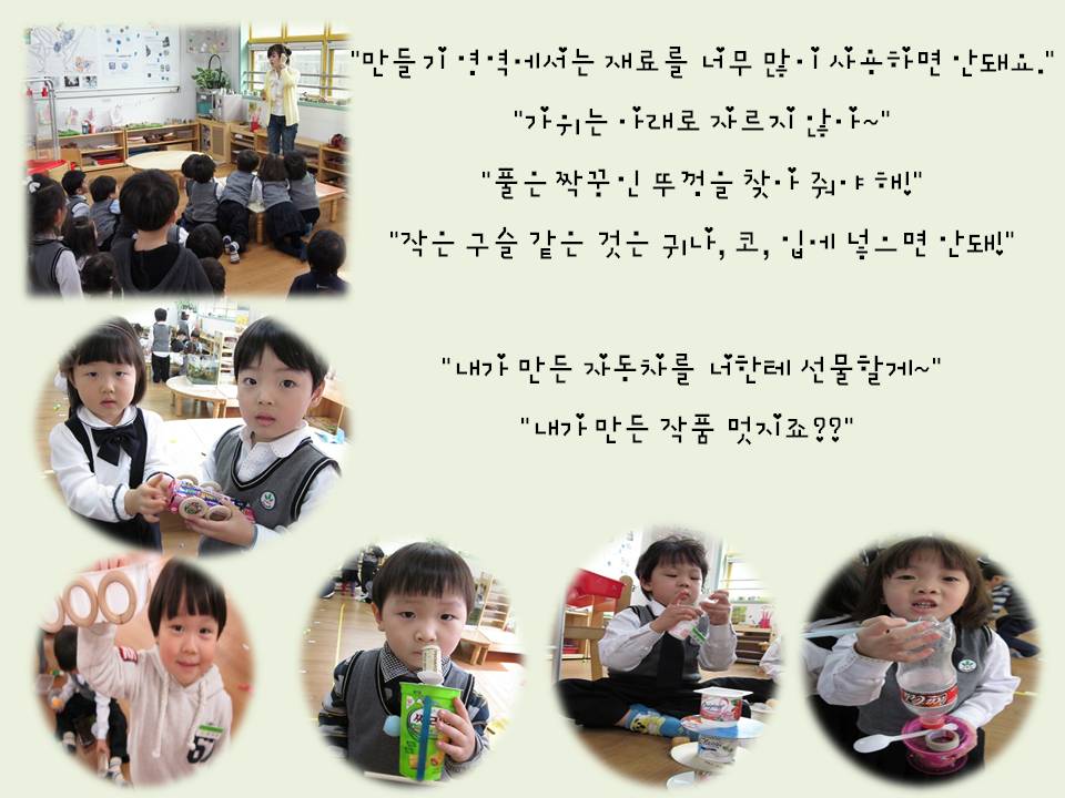 "이건 내가 만든 공룡이야~" "공룡은 입이 크게 있어야지!" "꼬리도 있어야 하고..." "난 엄마한테 선물할 선물을 만들고 있어" "이건 선풍기야~ 너무 더워서 선풍기가 생각이 났어" "붕붕붕~ 자동차야! 바퀴가 4개 달렸어" "칙칙폭폭 기차는 자동차보다 바퀴가 여러개 더 많이 달려있는데."
