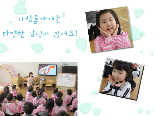 그러한 상황을 잘 해결하기 위해 마음이 가장 잘 드러나는 <표정>을 보며 감정에 대해 알아보기로 합니다. 교사: (웃는표정) 너희들은 언제 이런 표정을 지었니? “친구가 잘 해 줄때” “형아가 잘 해 줄때 웃어요.”