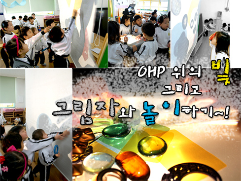 교실의 OHP는 어린이들이 빛 놀이를 할 수 있도록 합니다. OHP의 특성상 어린이들은 빛과 더불어 그 이면의 그림자를 마주하게 됩니다.