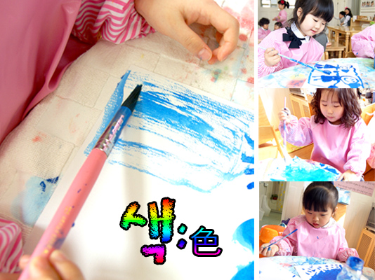 “어! 똑같은 파란색인데 이건 진하고 이건 좀 연한 것 같아.” “이건 하늘색 같은데~” “왜 그렇지?” “내가 아까 붓으로 계속 계속 칠하니까 더 더 진해졌어.” “나는 물을 많이 섞으니까 하늘색처럼 보였는데~”
