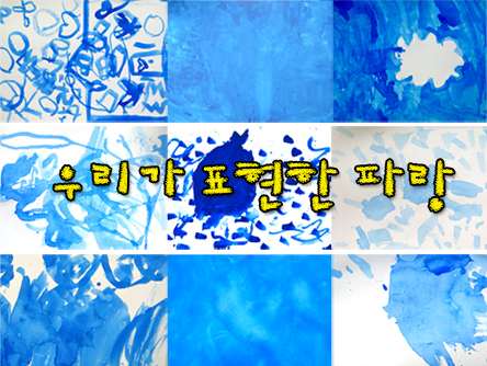 여러 색의 물감 중 한 가지 색을 먼저 지원한 이유도 평소 어린이들에게 많이 노출되어 있는 여러 색들을 하나하나 더 깊이 있게 들여다 볼 수 있는 기회를 주기 위해서입니다. 파란 물감 한 가지 색이지만 사실 물의 농도, 또 붓을 어떻게 터치하느냐에 따라 다양한 느낌과 질감, 여러 가지의 <파랑>을 나타낼 수 있었습니다.