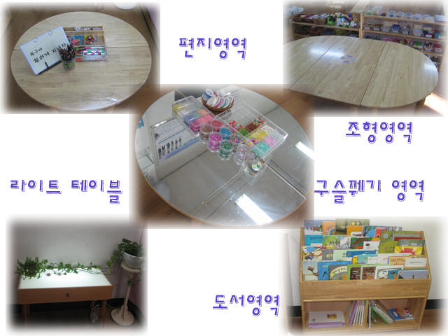 <언어영역>에서는 사랑하는 가족, 친구에게 편지를 쓸 수 있고, 다양한 도장으로 편지지 디자인을 할 수 있답니다.아이들은 이곳에서 자연스럽게 글자와 친숙해 진답니다. <미술영역>에는 꼬마화가가 되어볼 수 있는 다양한 미술 도구가 있고요, 재미있는 책들이 가득한 <도서영역>에서는 생각을 쑥쑥 키워나갈 수 있습니다.