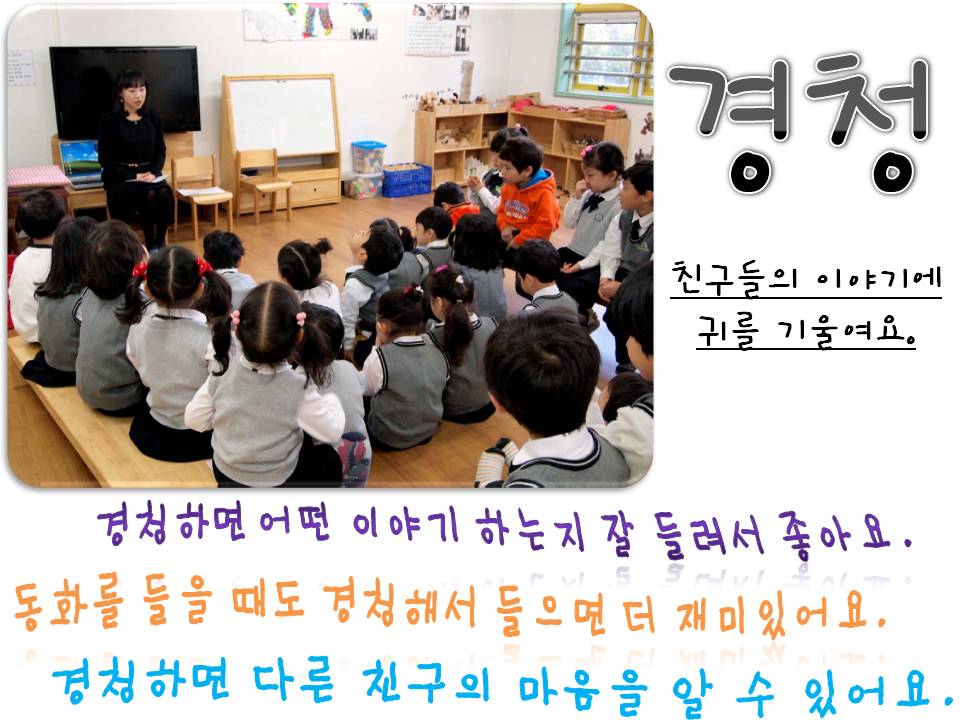 꽃잎반 친구들이 다소 낯선 <경청>에 대해 알아보았습니다. 경청은 ‘상대방의 이야기에 집중하여 듣는 것’을 말합니다. 새로운 단어를 알게 된 우리 어린이들은 경청의 뜻에 대해 집중하여 들어봅니다. <귀 쫑긋> 이라는 말보다는 형님이 된 만큼 경청이라는 조금 어려운 단어를 사용해보기로 했습니다. 또 친구들과 함께 경청 연습도 해 보았답니다.