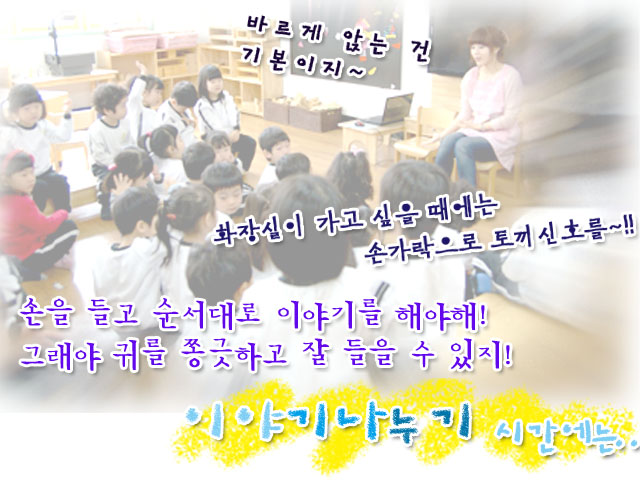 -의자줄 친구들은 의자에 앉아서 두 다리를 가지런히 모으고, 바닥줄 친구들은 아빠다리를 하고 앉아서 손을 무릎에 올려둡니다. 그리고 눈은 반짝, 귀는 쫑긋! 선생님과 친구들의 이야기를 듣습니다. 다른 친구들과 공유하고 싶은 이야기가 있을 때에는 조용히 손만 들어서 의견을 표시합니다. 친구들과 다함께 이야기를 나눌 때에는 목이 말라도 조금은 참을 수 있어요. 화장실이 급하게 가고 싶을 때에는 손가락을 브이로 만들어서 머리 위에 올려 토끼신호를 하지요.