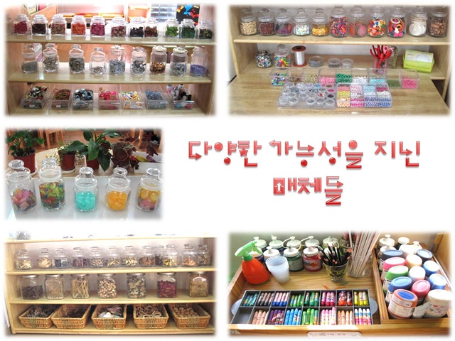 매체의 특성을 탐색하면서 이를 어디에 활용하면 좋을지 함께 고민해 본 후, 교실 영역에서 매체를 찾아보았습니다. 교실영역에는 자연물, 구슬종류, 반투명한 매체, 철로 만들어진 매체, 재활용품 등 비슷한 종류의 매체들끼리 제시되어있습니다. 비슷한 종류끼리 모여 있는 매체는 심미적인 아름다움을 느끼게 해줄 뿐만 아니라 분류능력을 기르는데도 도움이 됩니다. 또한 매체가 어디에 위치해있는지 알고 있는지 아는 것은 매체를 활용하는데 도움이 될 수 있습니다. 앞으로 잎새반 친구들은 이 다양한 매체를 활용하여 어떤 것들을 표현해 나가게 될까요?
