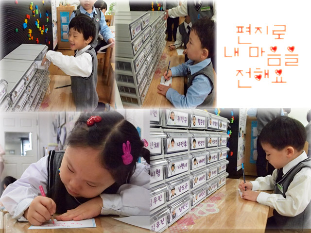 교실의 영역 중 언어영역에 새로운 소식이 생겼어요. 예쁜 내 사진과 이름이 적힌 편지함이 새로 생겼답니다. “편지함에는 친구 얼굴을 다 볼 수 있어서 좋아요.” “내가 좋아하는 친구한테 편지 쓸래요.”
