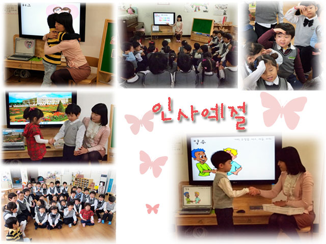 인사에는 말로 하는 인사, 행동으로 하는 인사 (악수, 허그, 경례) 가 있답니다. 상황에 맞게 어떻게 인사해야 하는지 알고 친구들 앞에서 시연도 해 보았답니다. 교사: 인사는 왜 하는 걸까요? “친구나 선생님을 만나서 너무 좋아서요~” “인사를 하면 기분이 좋아져요.” “인사를 하면 몰랐던 친구들과도 친해질 수 있어요.”
