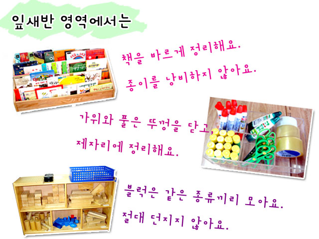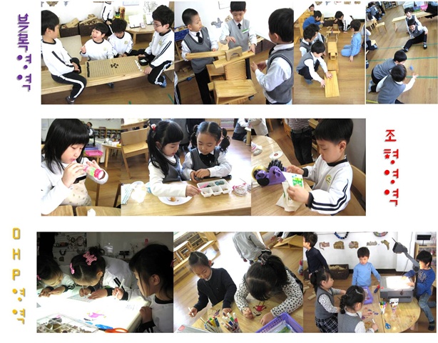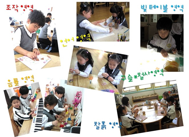 블록영역, 조작영역, 구슬ㆍ철사영역, 미술영역, 조형영역, 빛테이블영역, OHP영역, 찰흙영역, 음률영역, 언어영역 관찰영역...
