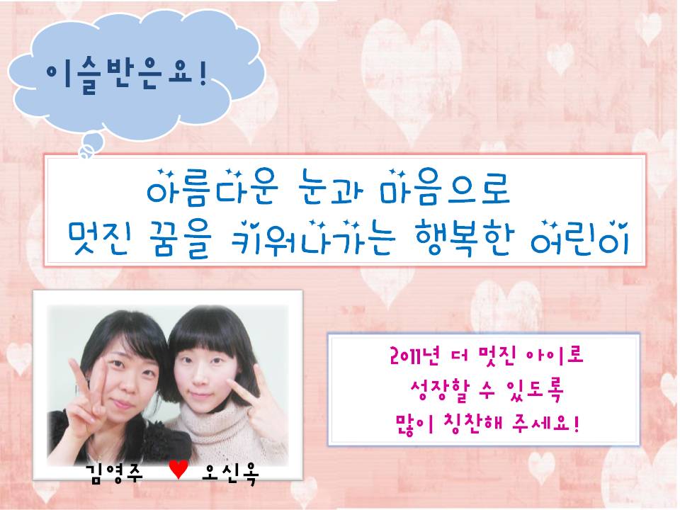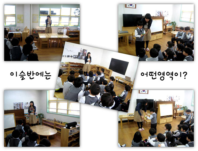 “이슬반에는 쌓기영역, 언어영역, OHP영역, 구슬영역, 미술영역, 조형영역이 있어!”